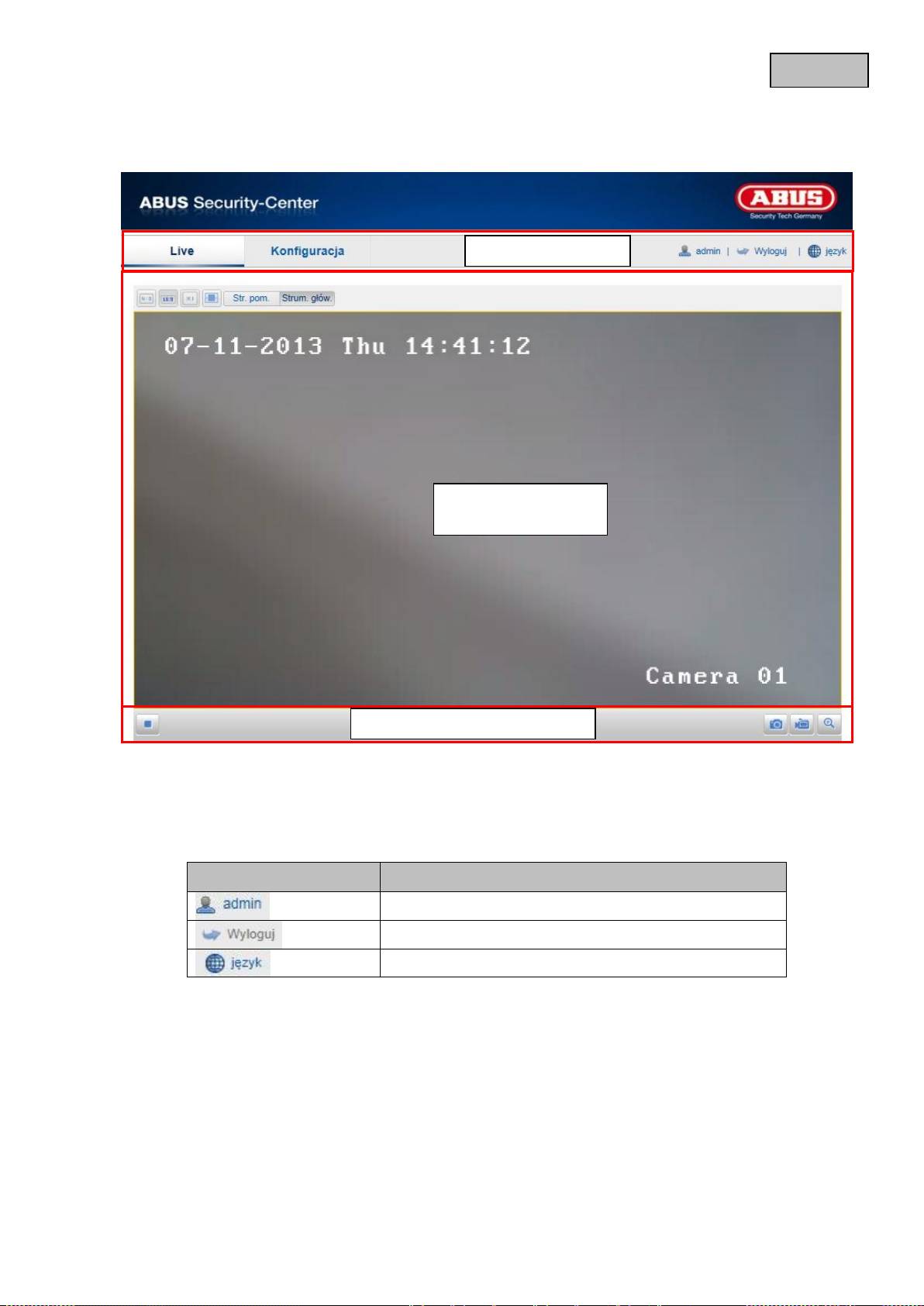 Otwórz stronę startową kamery sieciowej. Interfejs jest podzielony na następujące główne części.