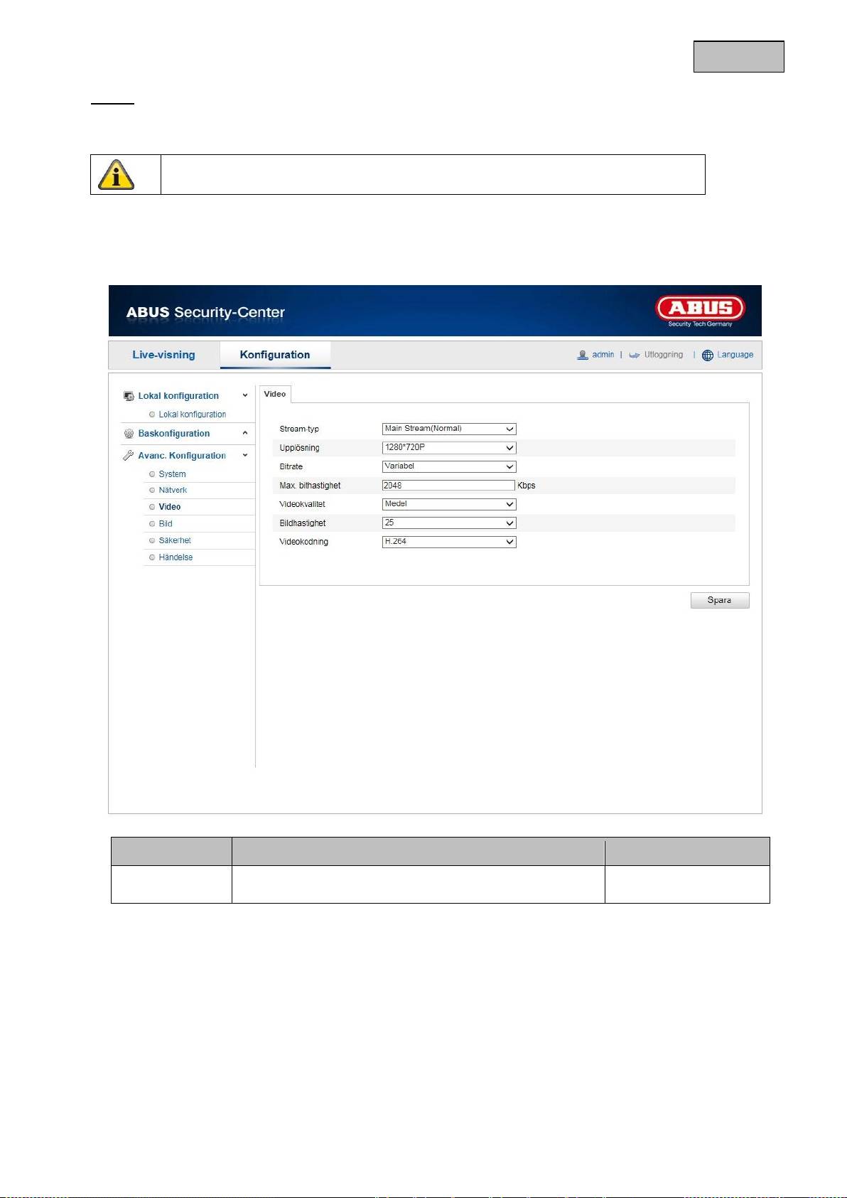 Anger bitrate för videoströmmen. Beroende på rörelsernas ”intensitet” kan bildkvaliteten variera.Här går det