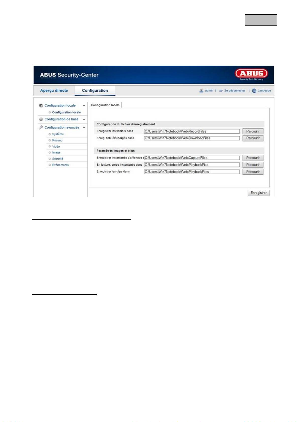 Vous pouvez enregistrer ici le chemin sous lequel les vidéos doivent être enregistrées.