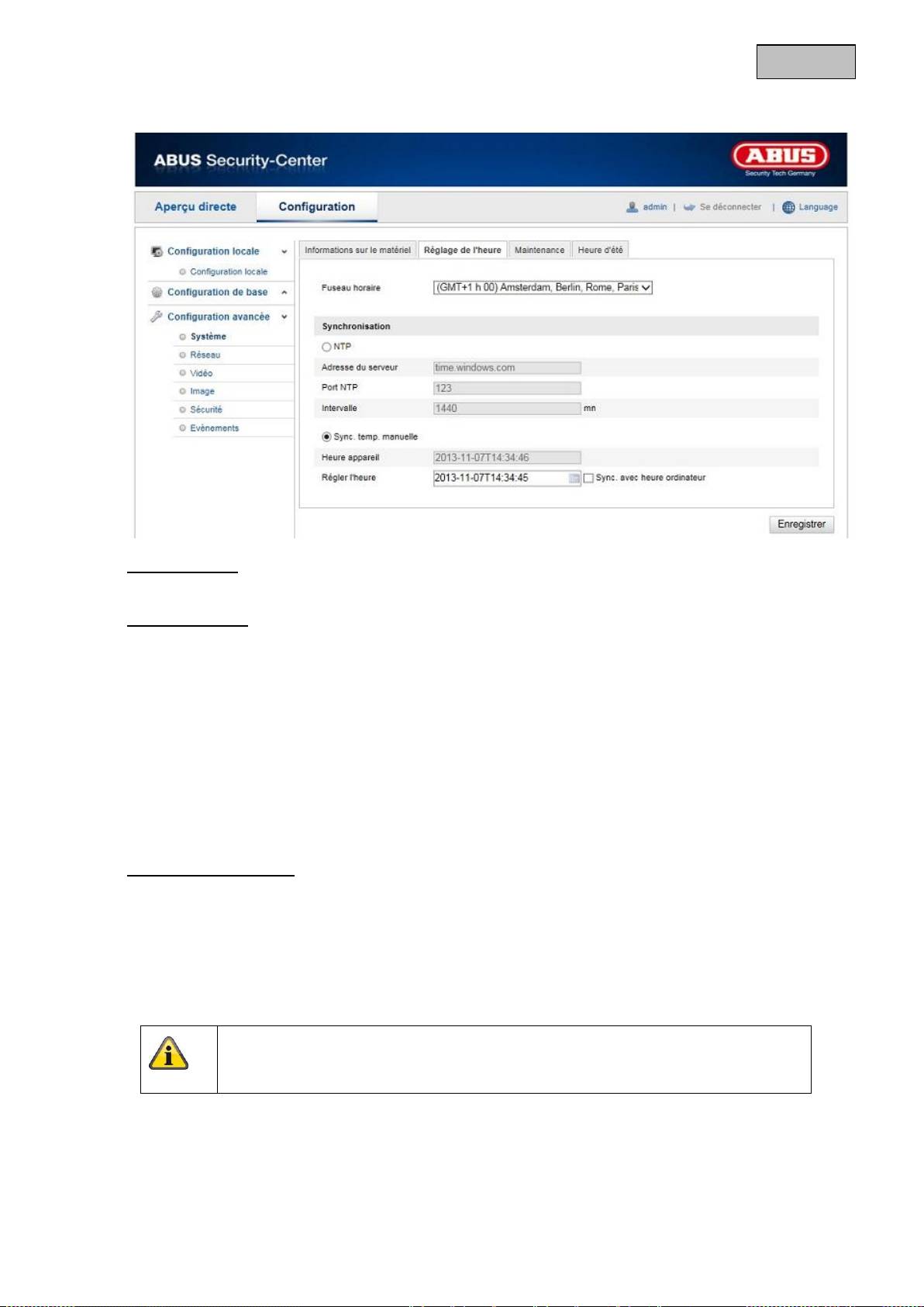 Cliquez sur « Sync. avec heure ordinateur » pour reprendre l'horaire de l'ordinateur.