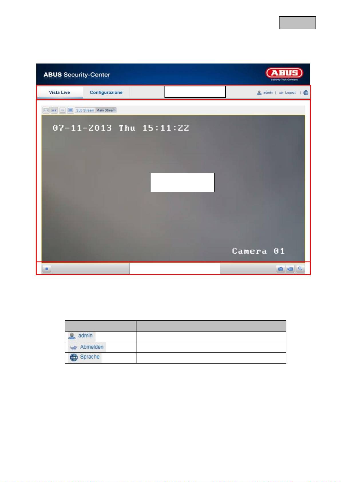 Aprire la pagina iniziale della videocamera di rete. La pagina è suddivisa nelle seguenti aree principali: