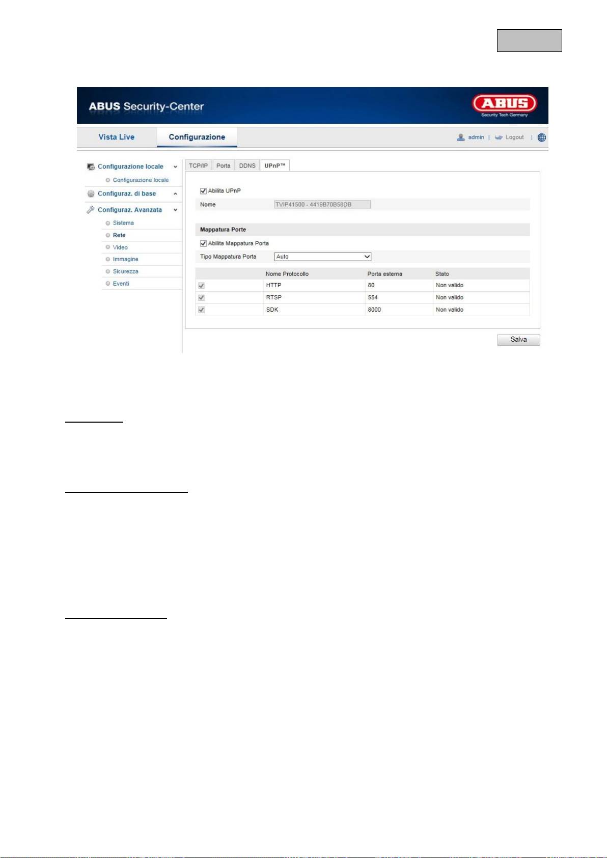 Con questa funzione viene attivato il port forwarding tramite UPnP (Universal Plug and Play) per i servizi di