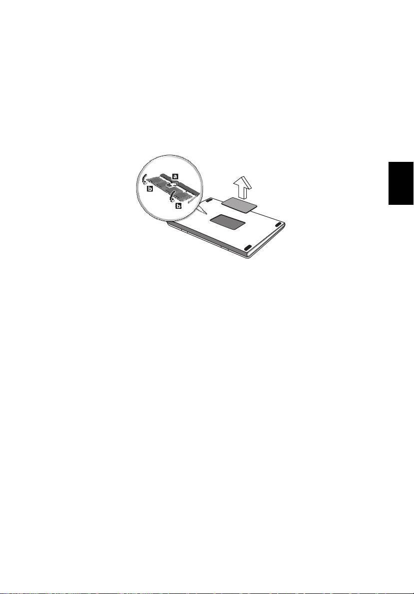 3 先将内存条的一头插入插槽 (a),然后轻轻按下整条内存使其卡入正确的位置