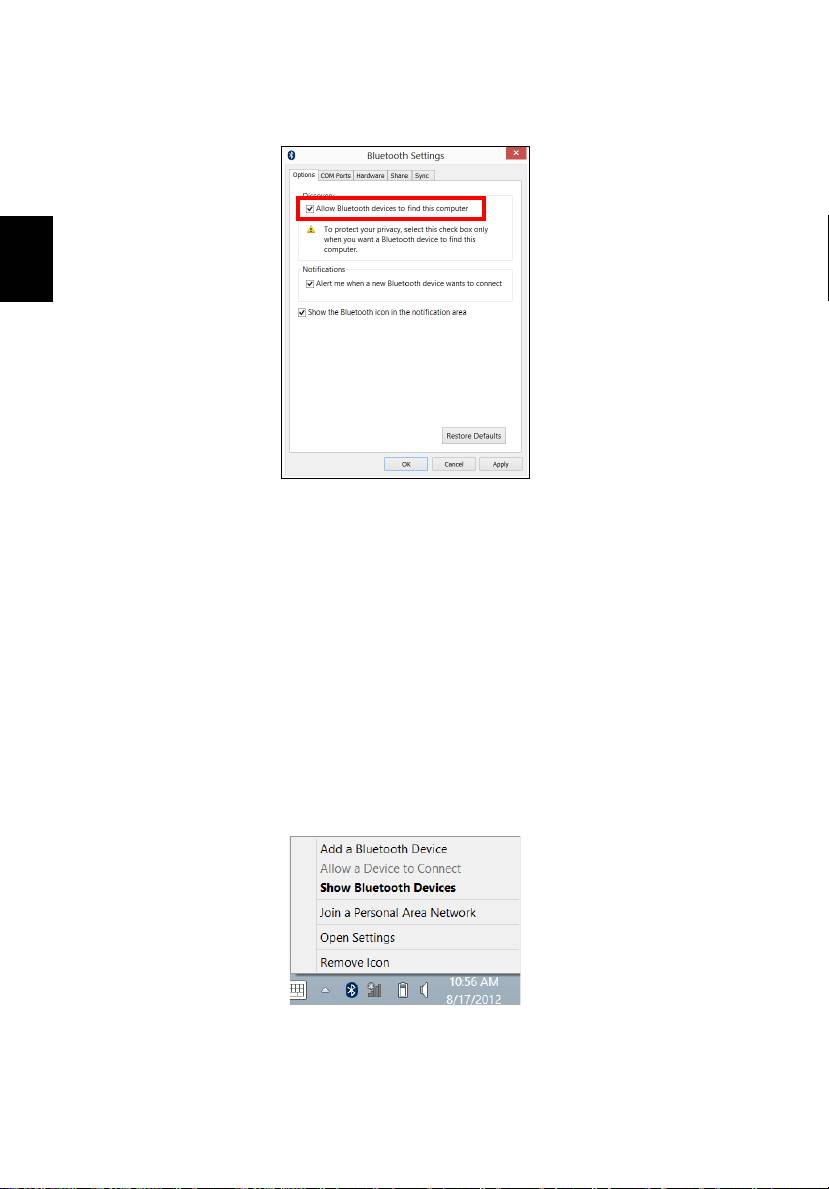 Zaškrtněte políčko Povolit zařízením Bluetooth vyhledání tohoto počítače,