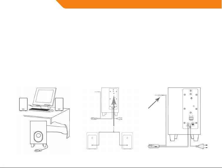 speakers to the subwoofer. To do so, insert the cable attached to the two satellite speakers into