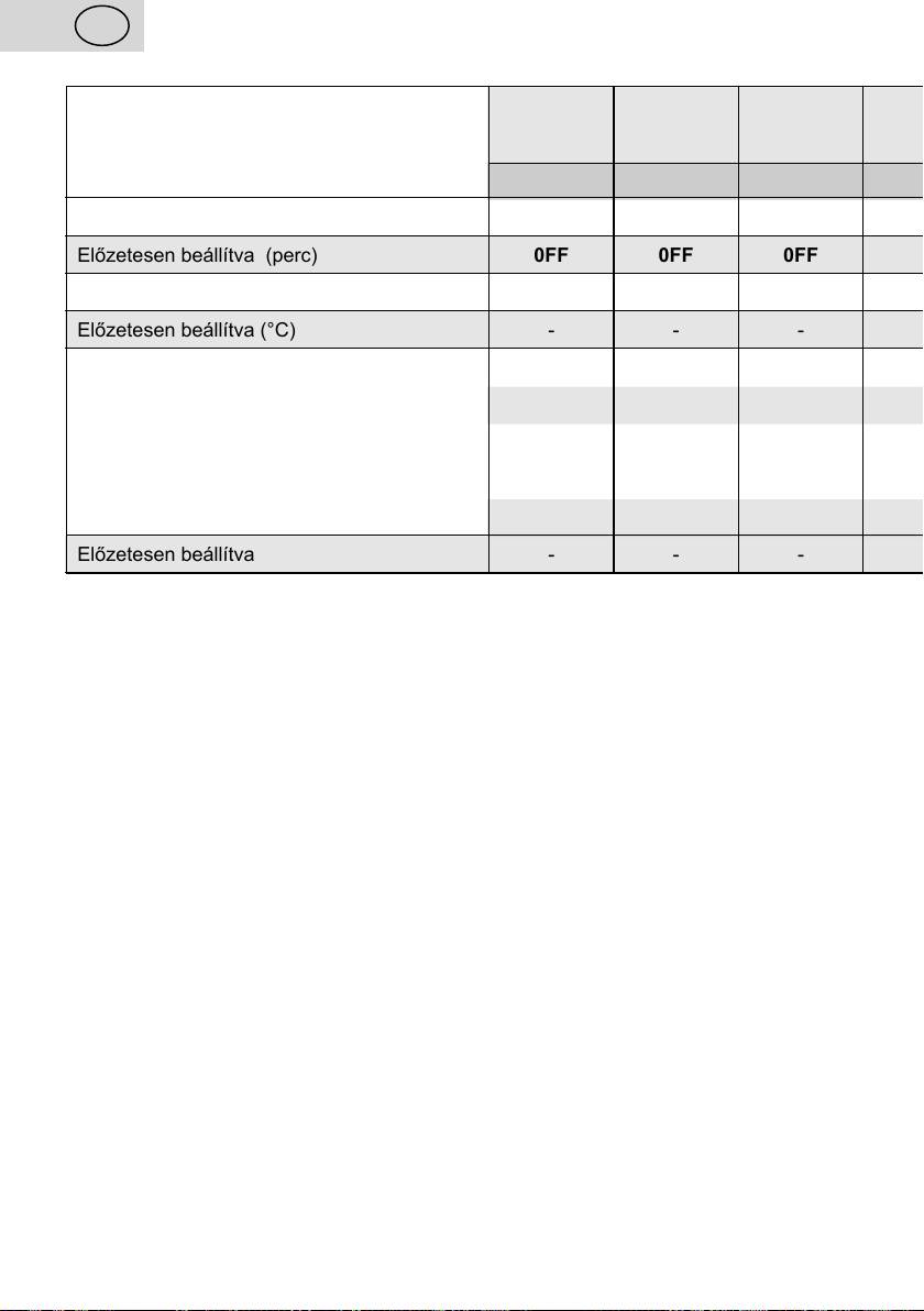 Az időbeállítás terjedelme (perc) 0 – 30 0 – 30 0 – 5 – 20 0 – 360 0 – 5 0 – 360 0 – 120 0 – 120 0 – 60