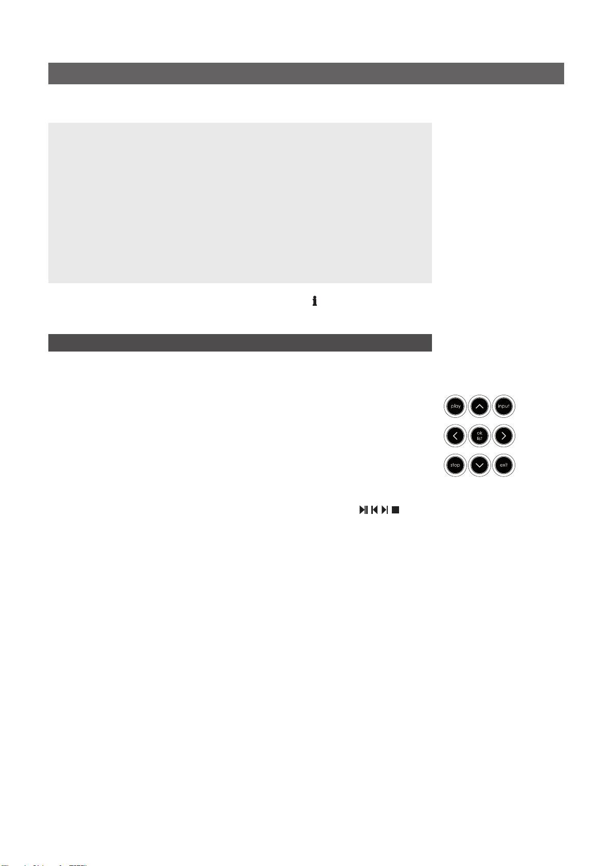 • 选择FM、DAB、iRadio、UPnP™ 和iPod/USB输入后,遥控器信息( )键可以用来显示有关输入的或