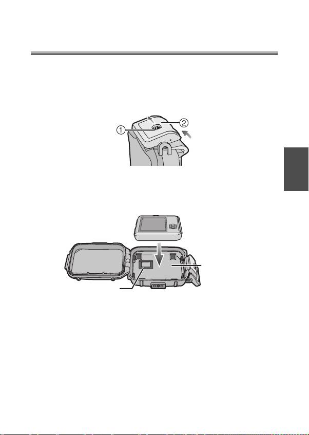 - 1 在滑動 1 的同時,用手指上推 2 打開盒扣。 2 將數位相機裝入盒子。