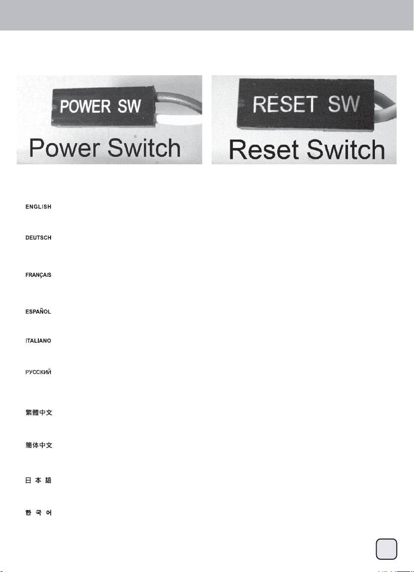 請參考主機說明書的Front Panel Connectors安裝Pin Define,將Connector插上;Power Switch 與Reset Switch並無正負極性之分,