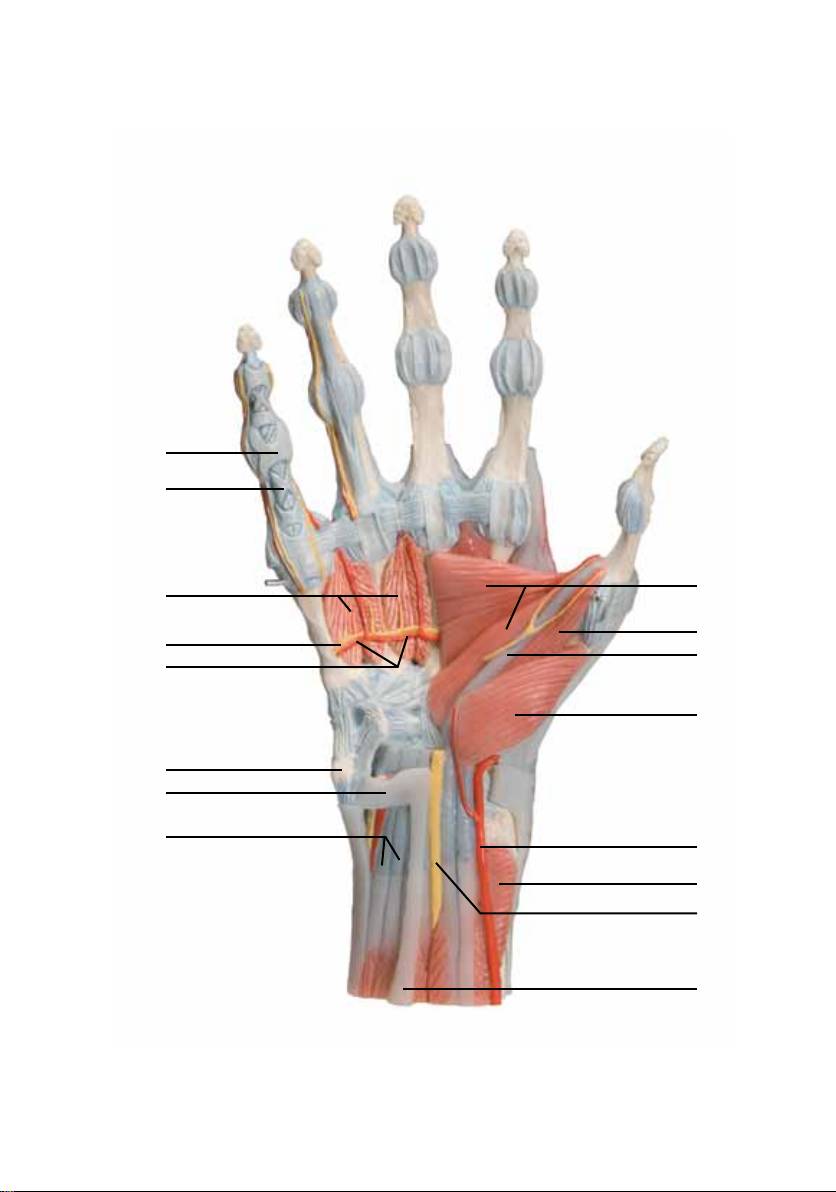 tos, nervos, artérias e veias da mão e parte inferior do antebraço. O lado dorsal mostra os músculos exten-