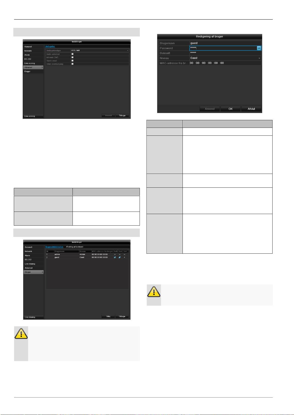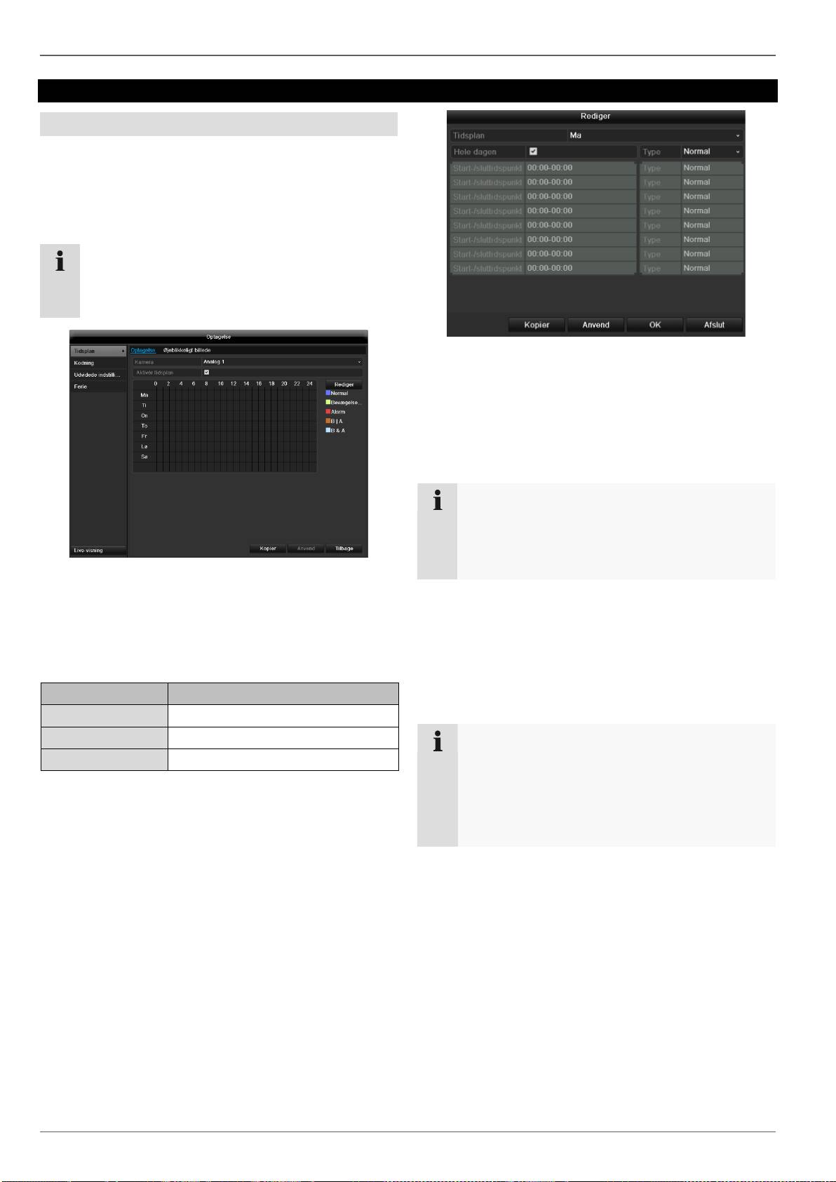 eller/og alarm, manuel optagelse, alle