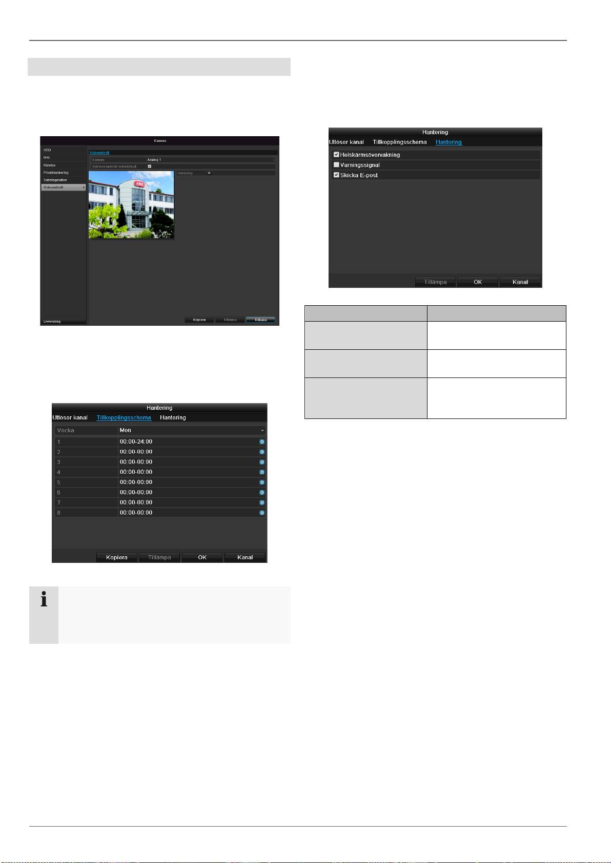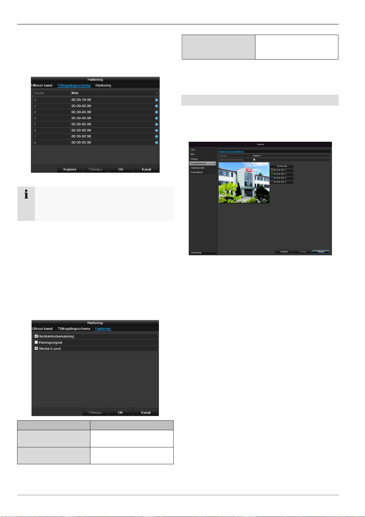 rörelsedetektering, privatzon, sabotageövervakning, videoförlust).