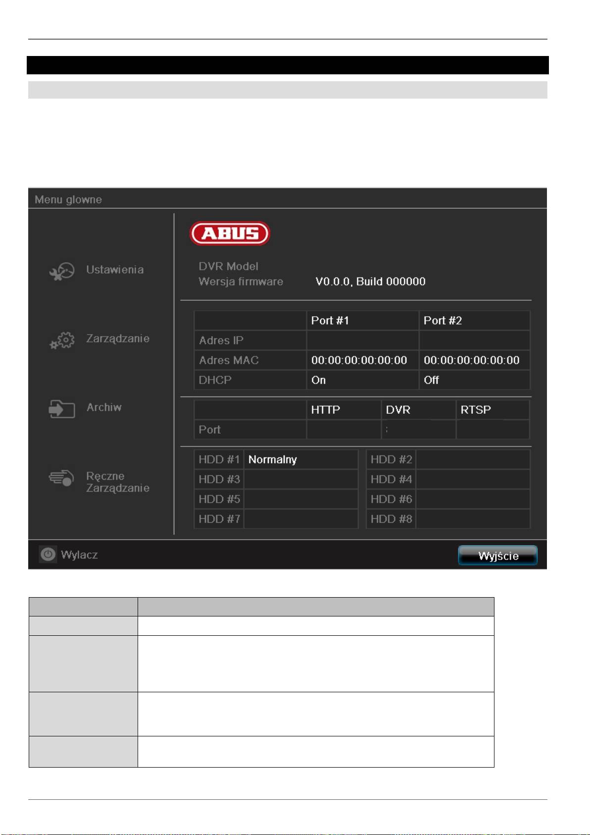 Menu urządzenia