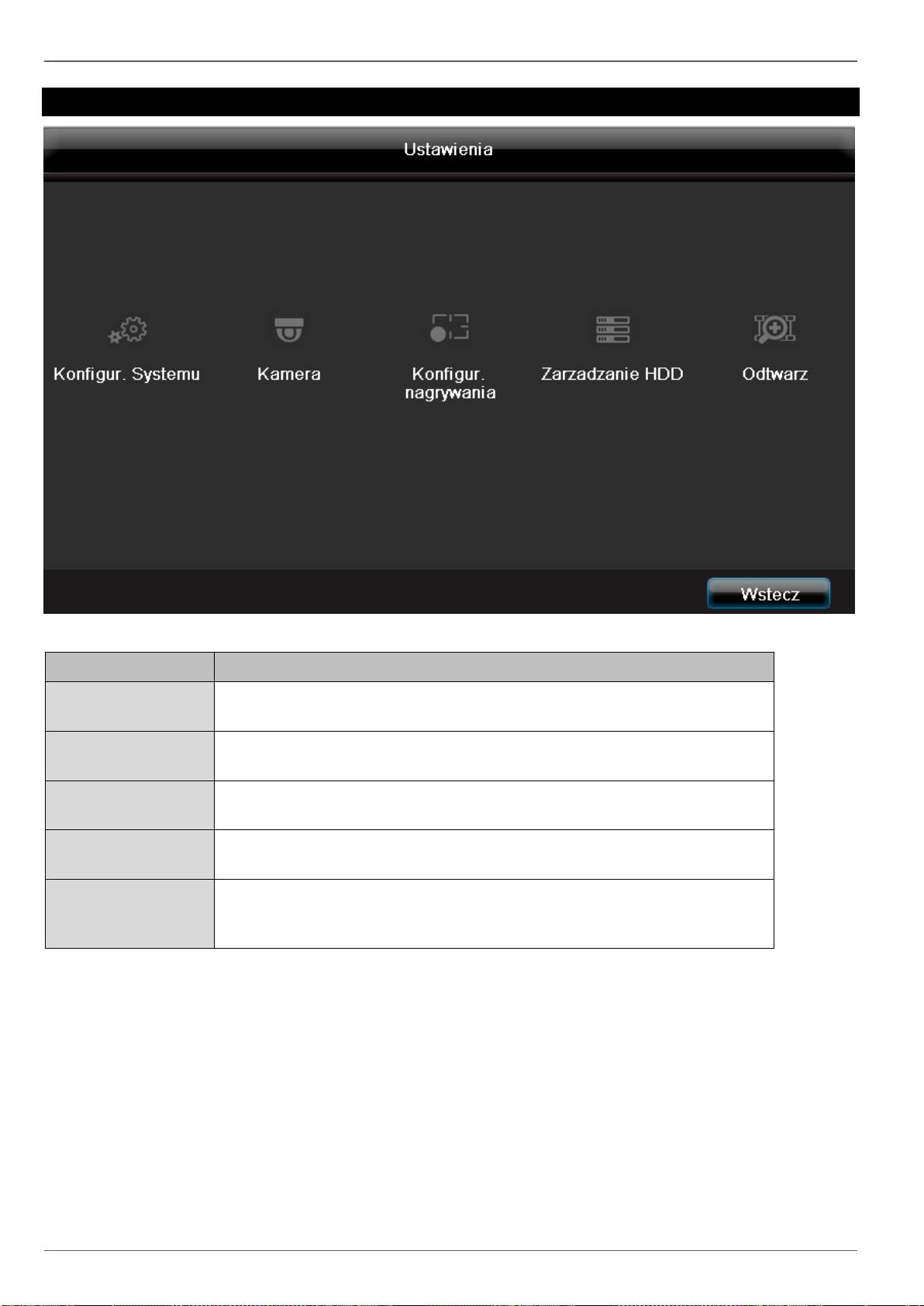 Przekierowuje do menu Konfiguracja, Kamera, Zapis, HDD, Odtwarzanie.