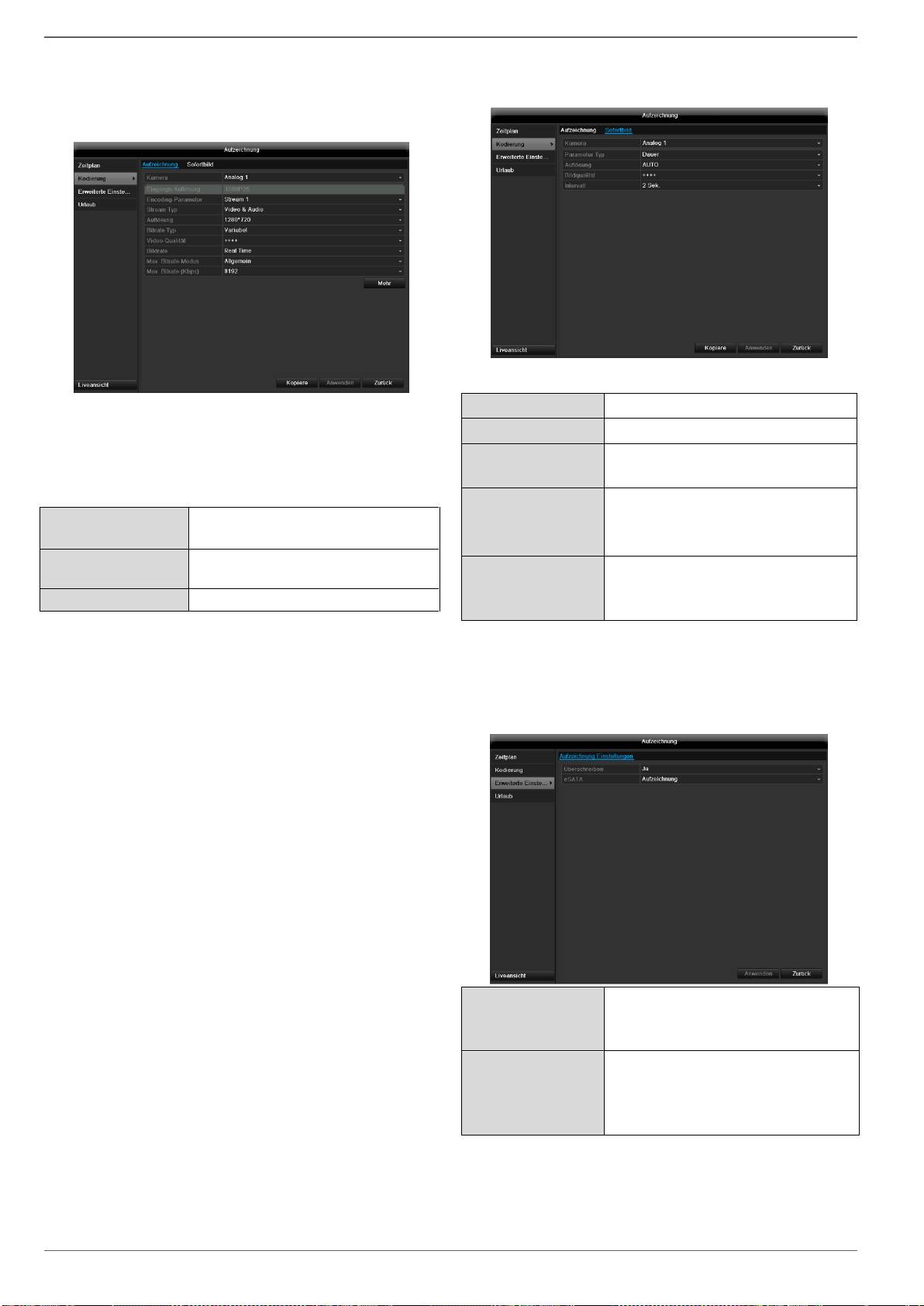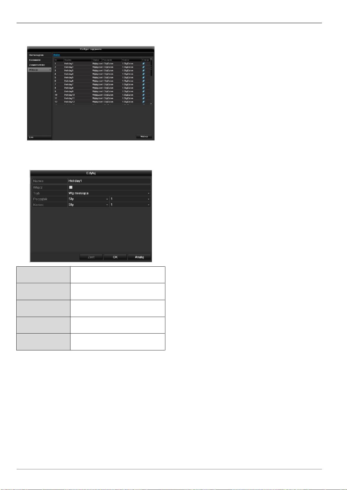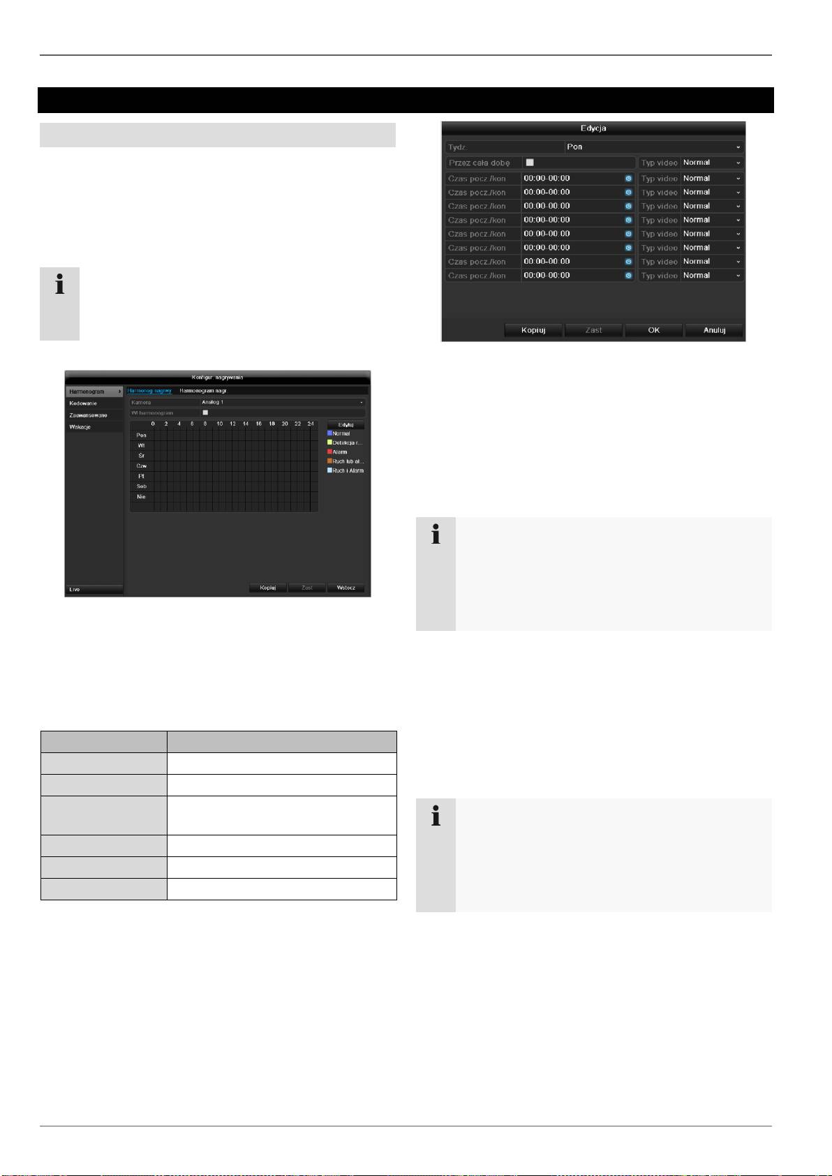 Menu do ustawiania parametrów zapisu (harmonogram, rozdzielczość kamery,