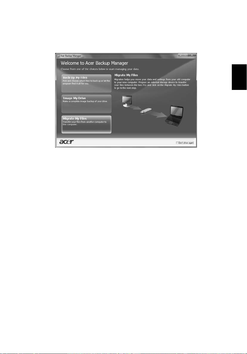 Manager > Acer Backup Manager. Se va deschide ecranul Bun venit; din acest