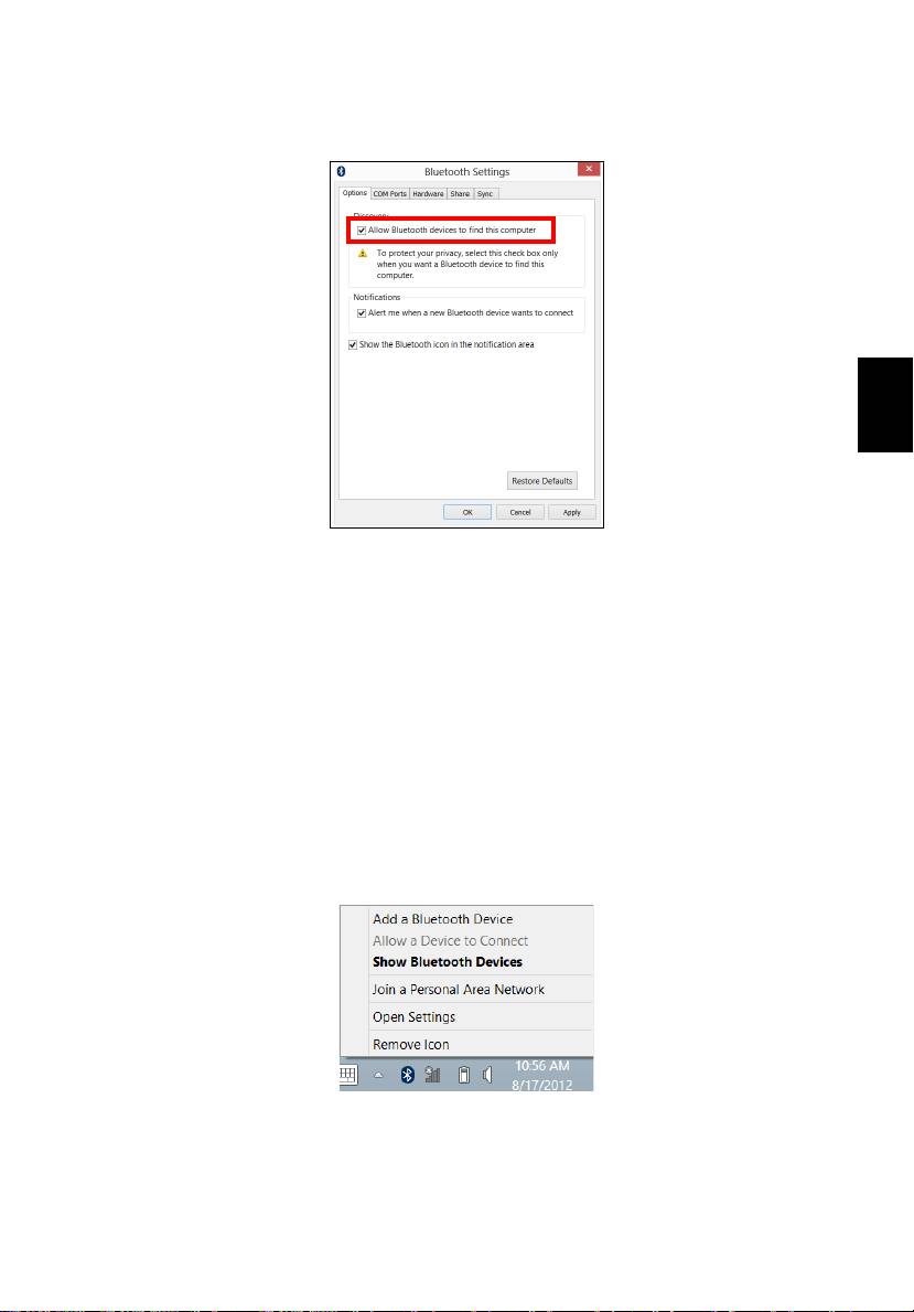 Pasirinkite žymimąjį langelį Leisti „Bluetooth“ įrenginiams rasti šį kompiuterį,