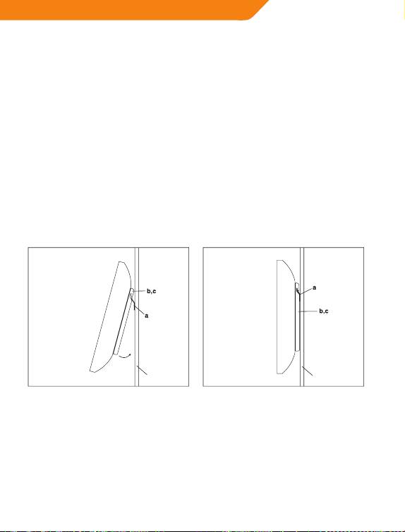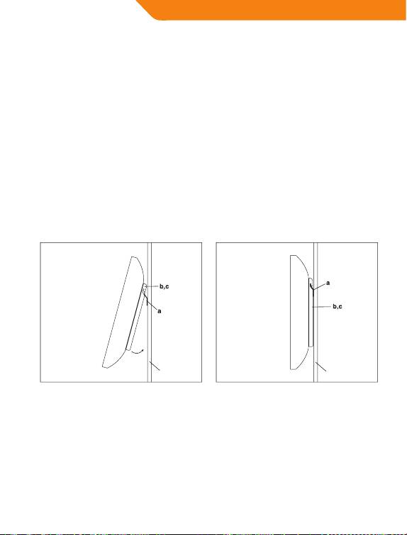 Сначала зацепите кронштейны монитора (b,c) за верх стеновой