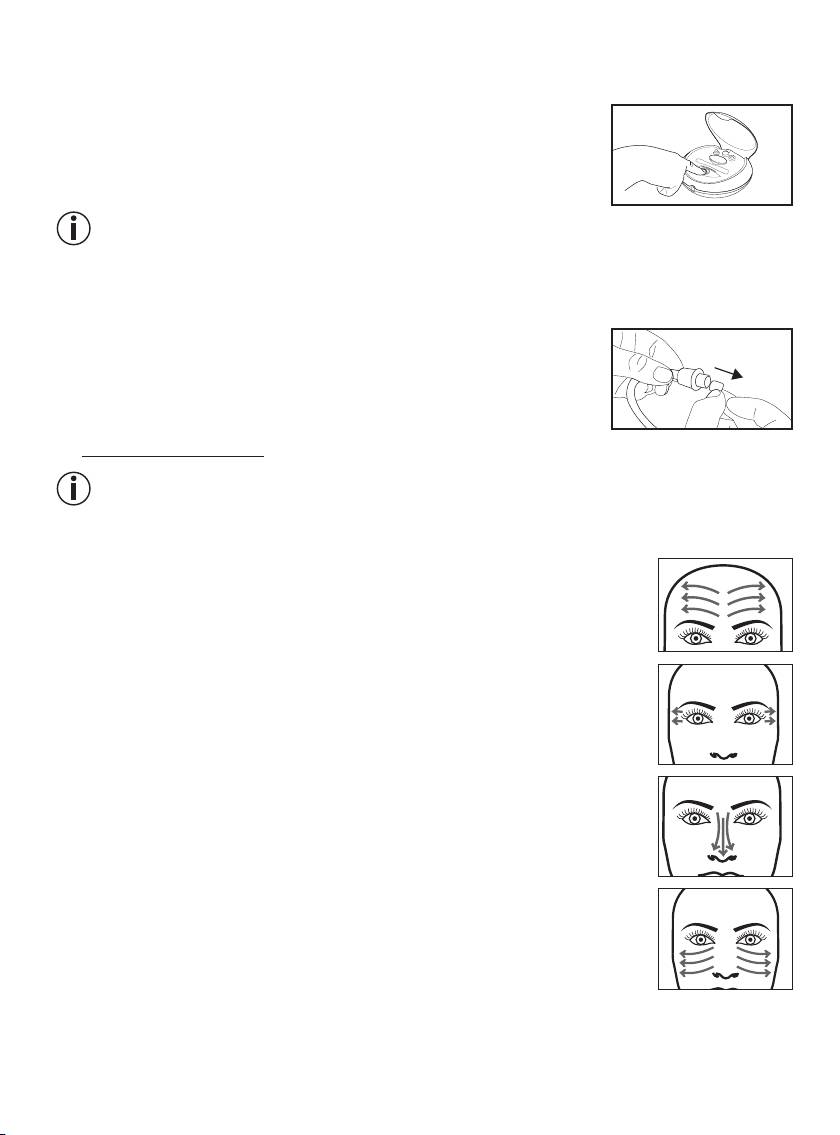 7. Rozpocząć zabieg od najniższego stopnia intensywności. Umieścić aparat na twarzy i przesuwać go po skórze.