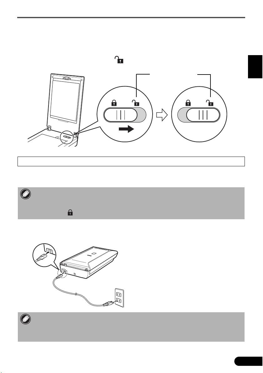 2 Ouvrez le couvercle du scanner et faites glisser le bouton de verrouillage du scanner