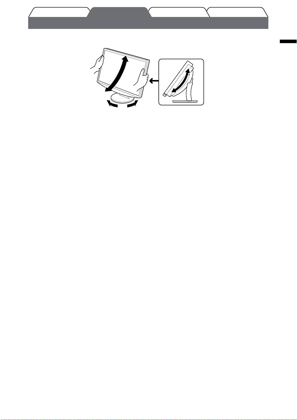 Hold left and right edge of the monitor with both hands, and adjust the screen height, tilt and swivel the screen to the