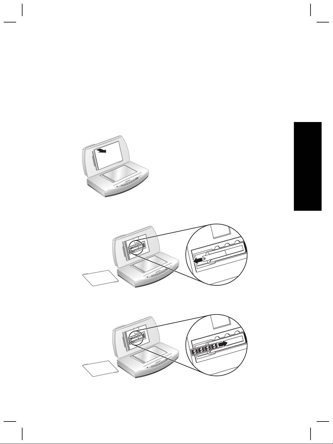 3. Introduceţi o bandă de negative în suport astfel încât, după închiderea capacului,