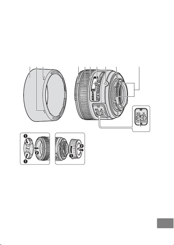 Sejajarkan tanda kunci tudung lensa (—{)