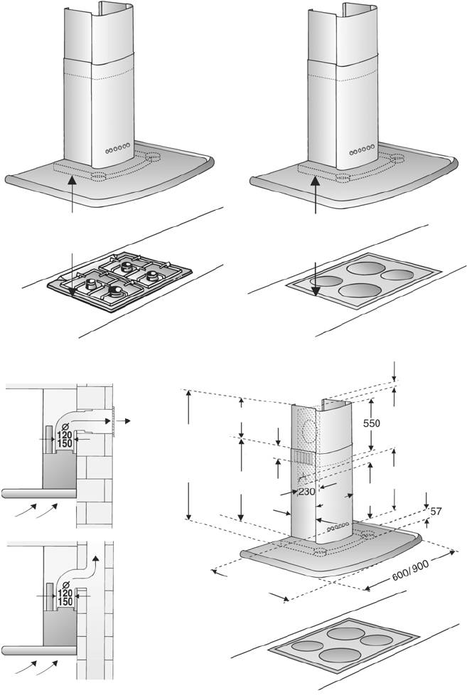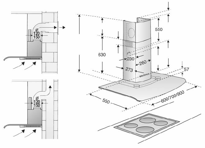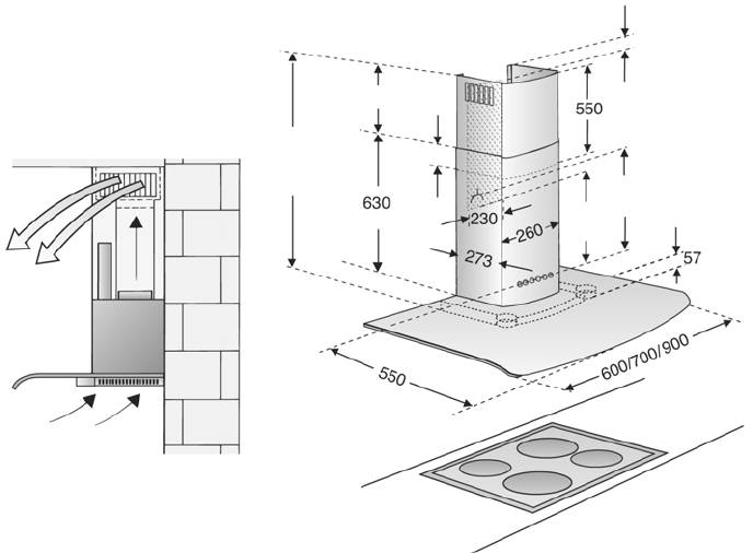 между варочной панелью и вытяжкой (550 мм