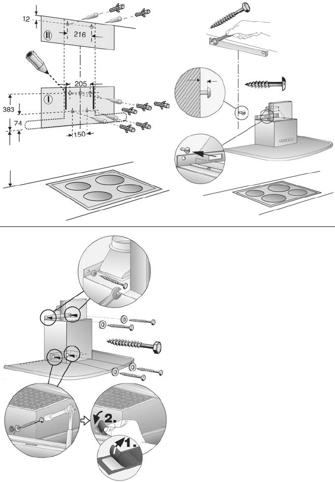 7. Подвесьте вытяжку на винт, установлен