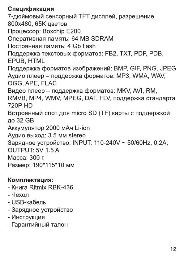 Инструкция к Книге Электронной Ritmix RBK-436 Silver
