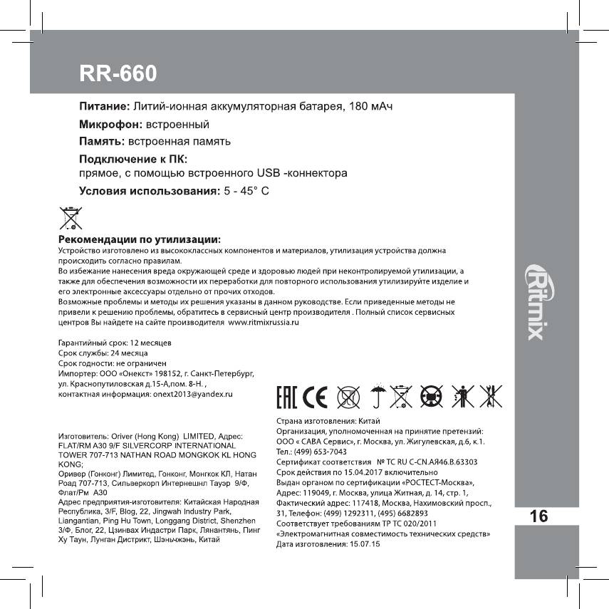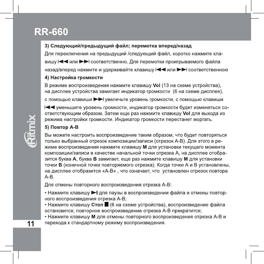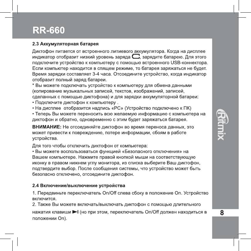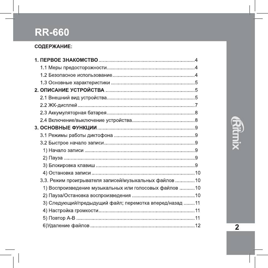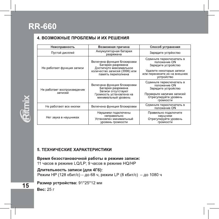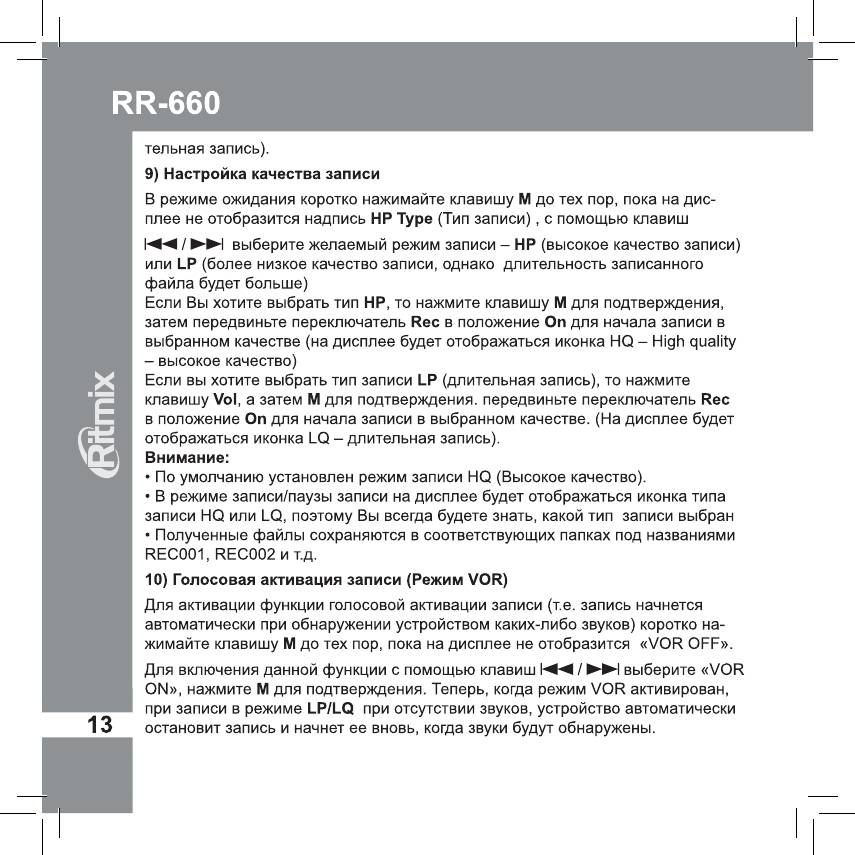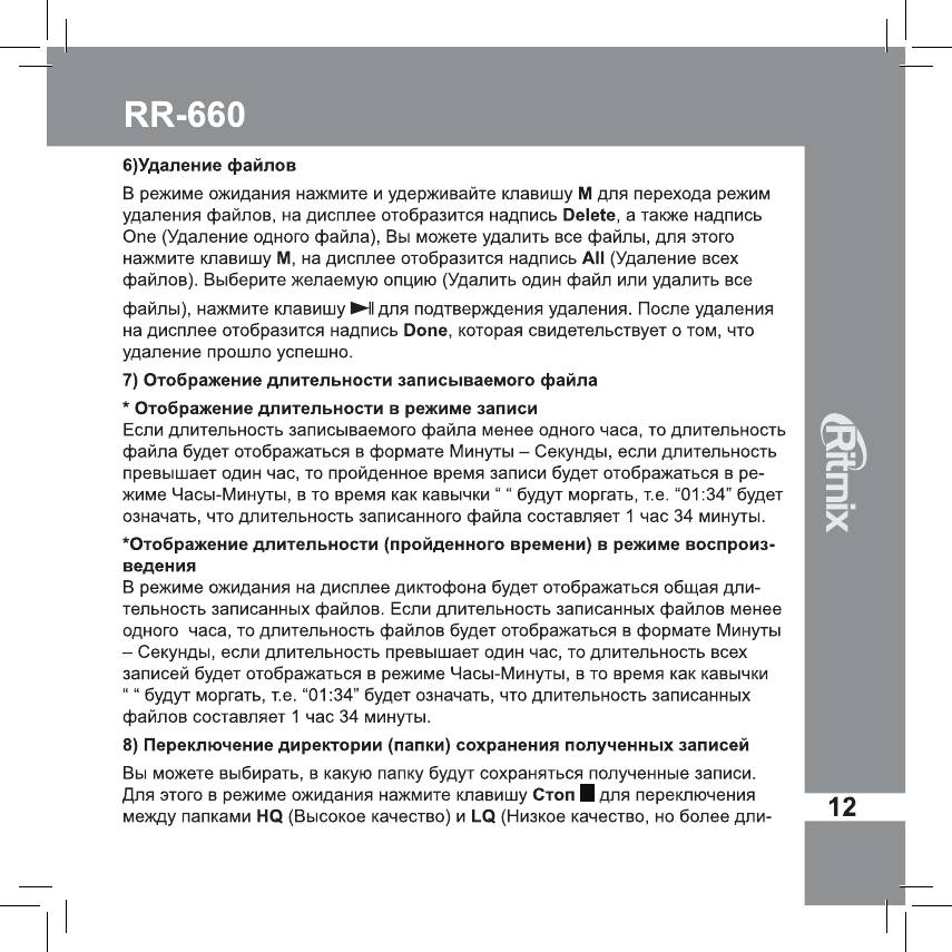 Инструкция к Цифровому Диктофону Ritmix RR-660 4Gb Red