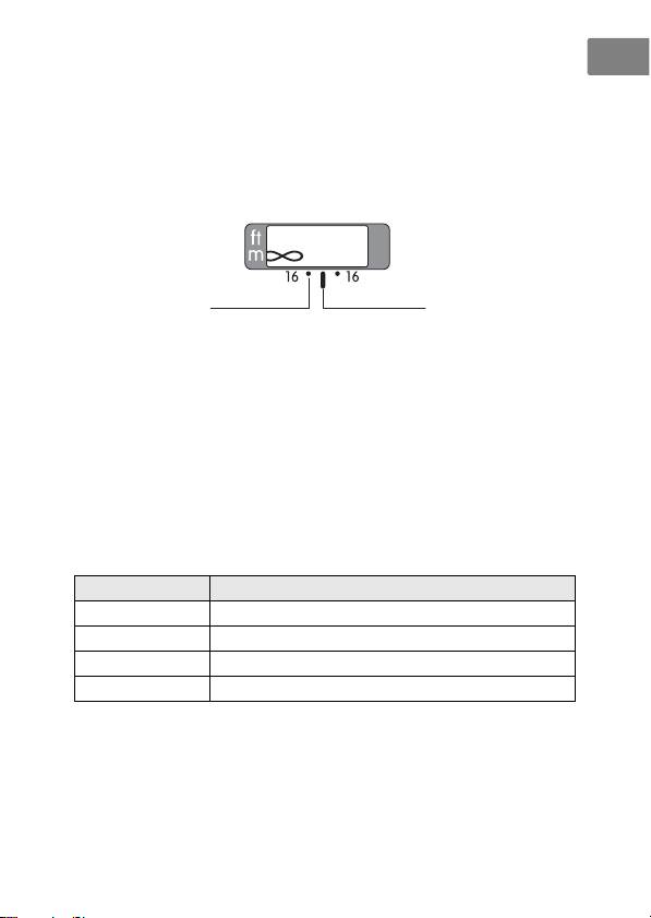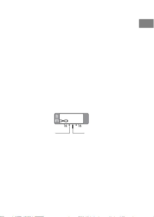 Focus distance indicator Graduated in meters and feet from 0.3 m/1 ft to