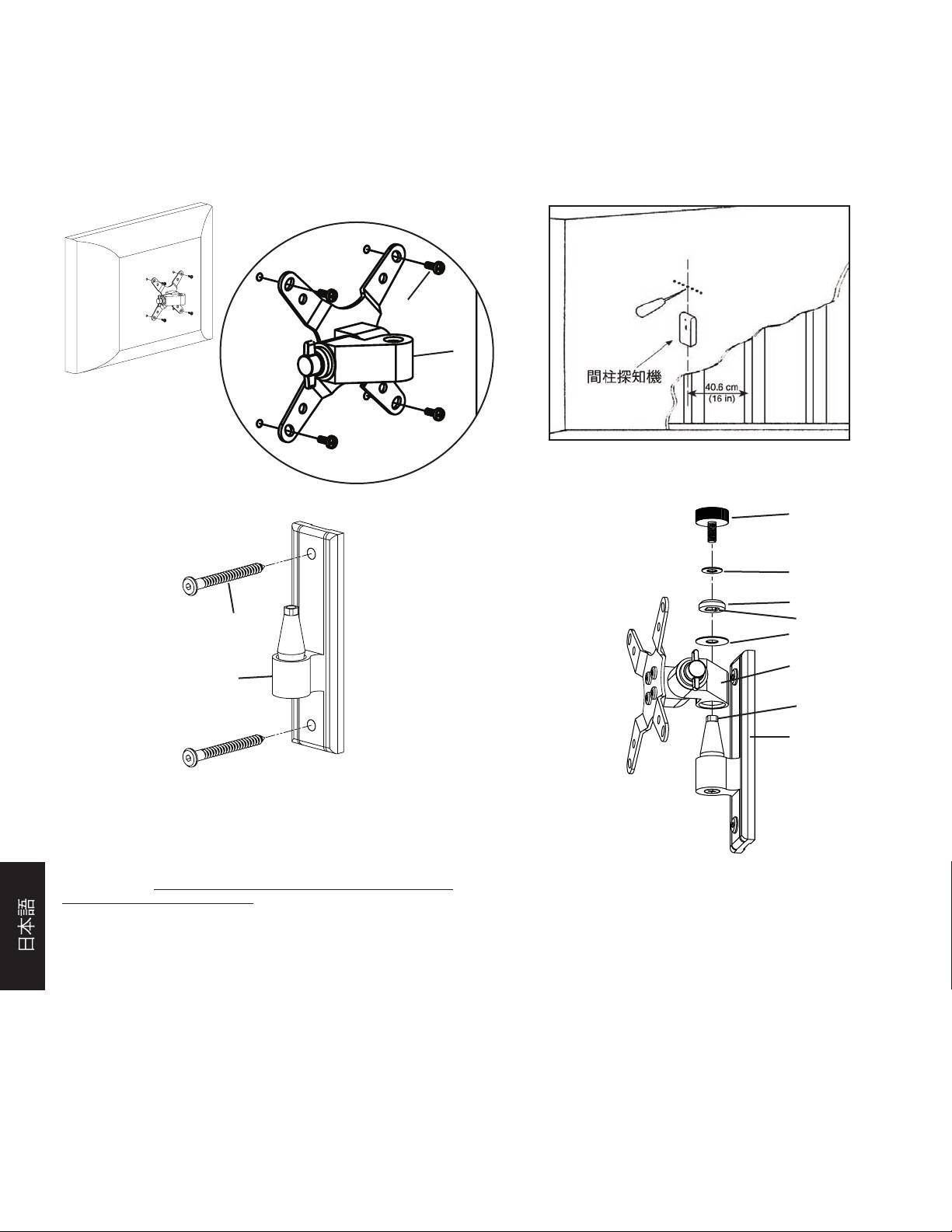 順序 2- 壁面に取り付ける:木製の間柱に取り付けるための金具が同梱されています。木製の間柱以外に取り付ける場合は、お近くの契約業者あるいは工具店にお問い合わせく